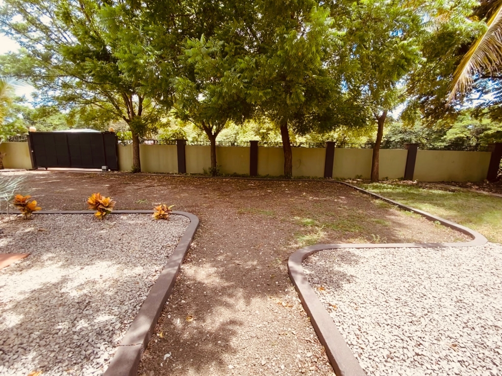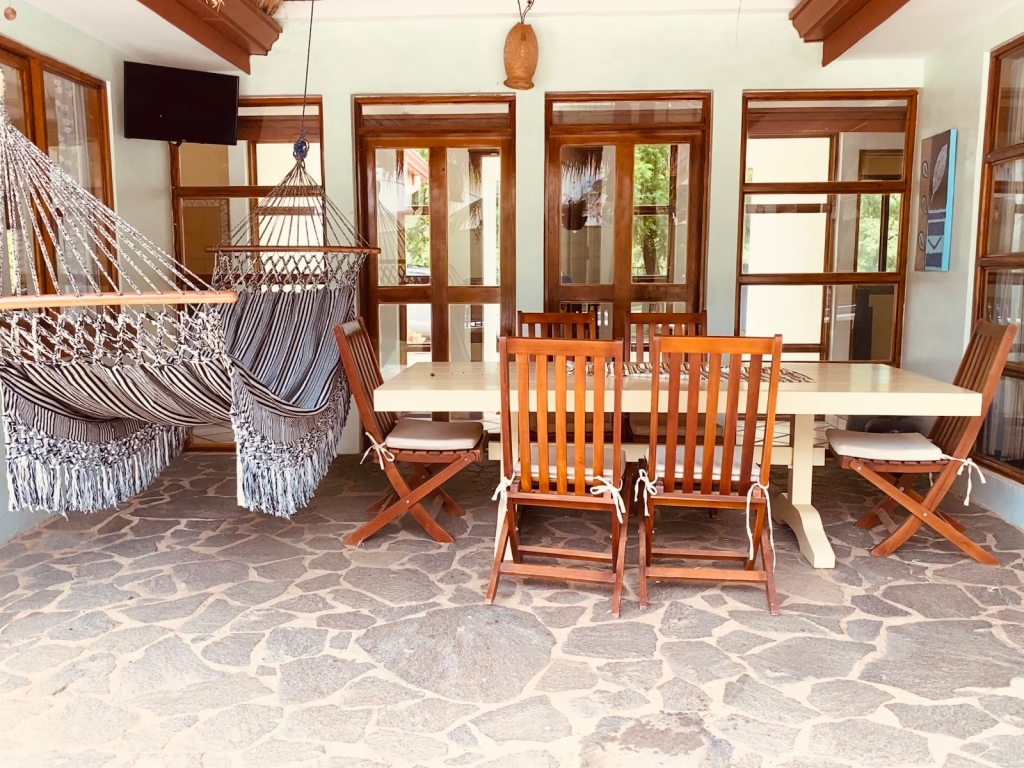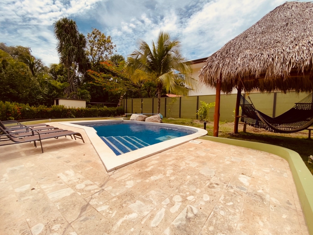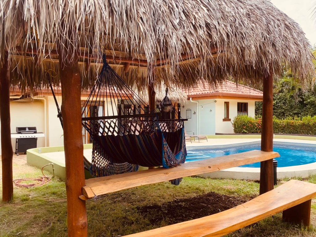 En el exterior, una piscina de tamaño mediano, está rodeada por un hermoso jardín con una amplia mesa en la terraza, un rancho cubierto de paja con hamacas y una parrilla de barbacoa.
