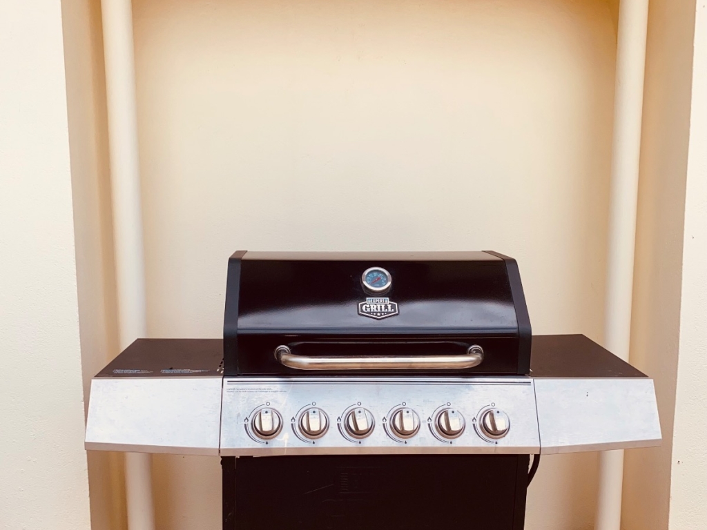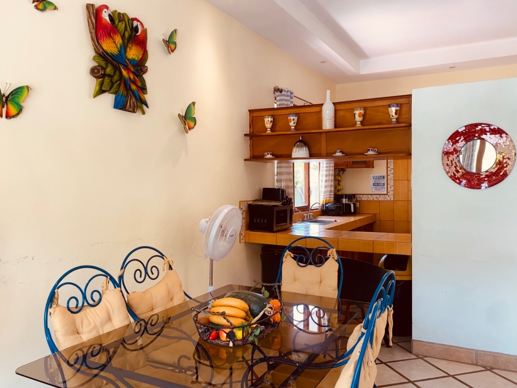 La cocina es totalmente equipada con electrodomésticos de acero inoxidable, desayunador de dos espacios y una mesa de vidrio en el comedor para todos los invitados.