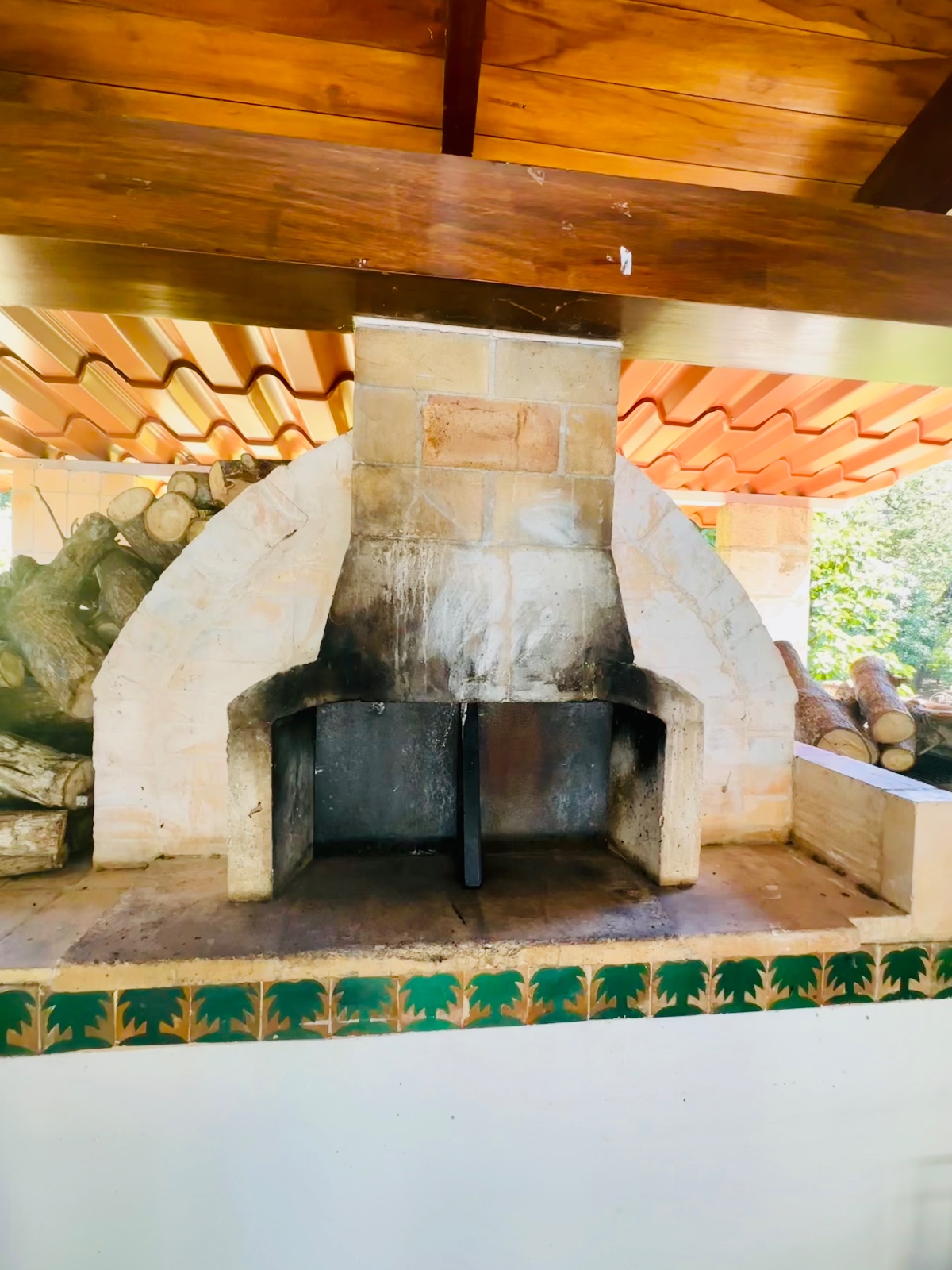Rancho con horno de barro, área de bar, cocina y medio baño.